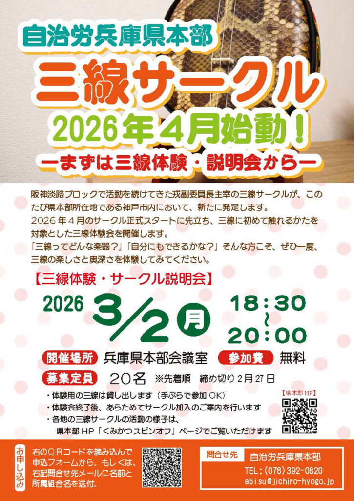 阪神淡路ブロックで活動を続けてきた戎副委員長主宰の三線サークルが、このたび県本部所在地である神戸市内において、新たに発足します。