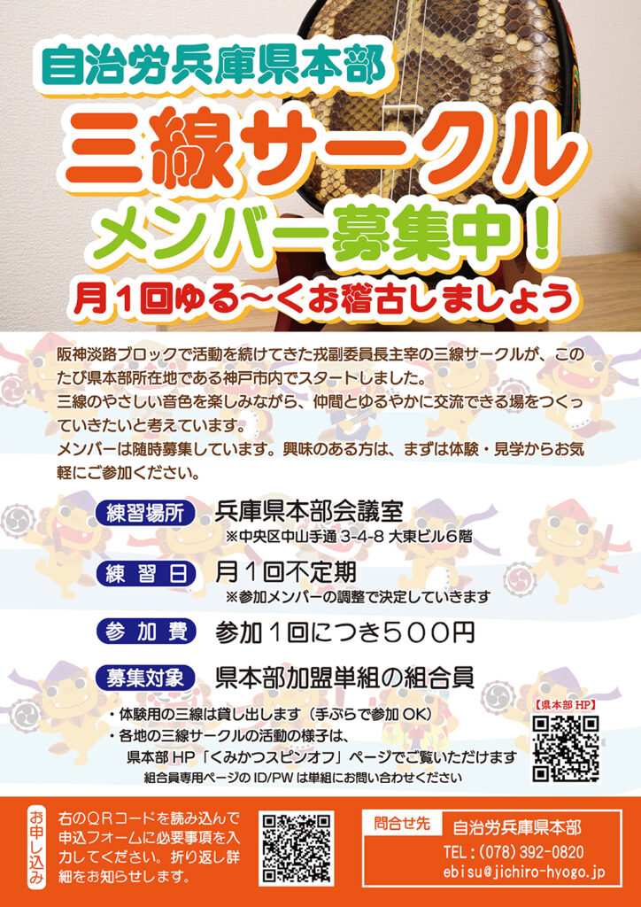 阪神淡路ブロックで活動を続けてきた戎副委員長主宰の三線サークルが、このたび県本部所在地である神戸市内でスタートしました。